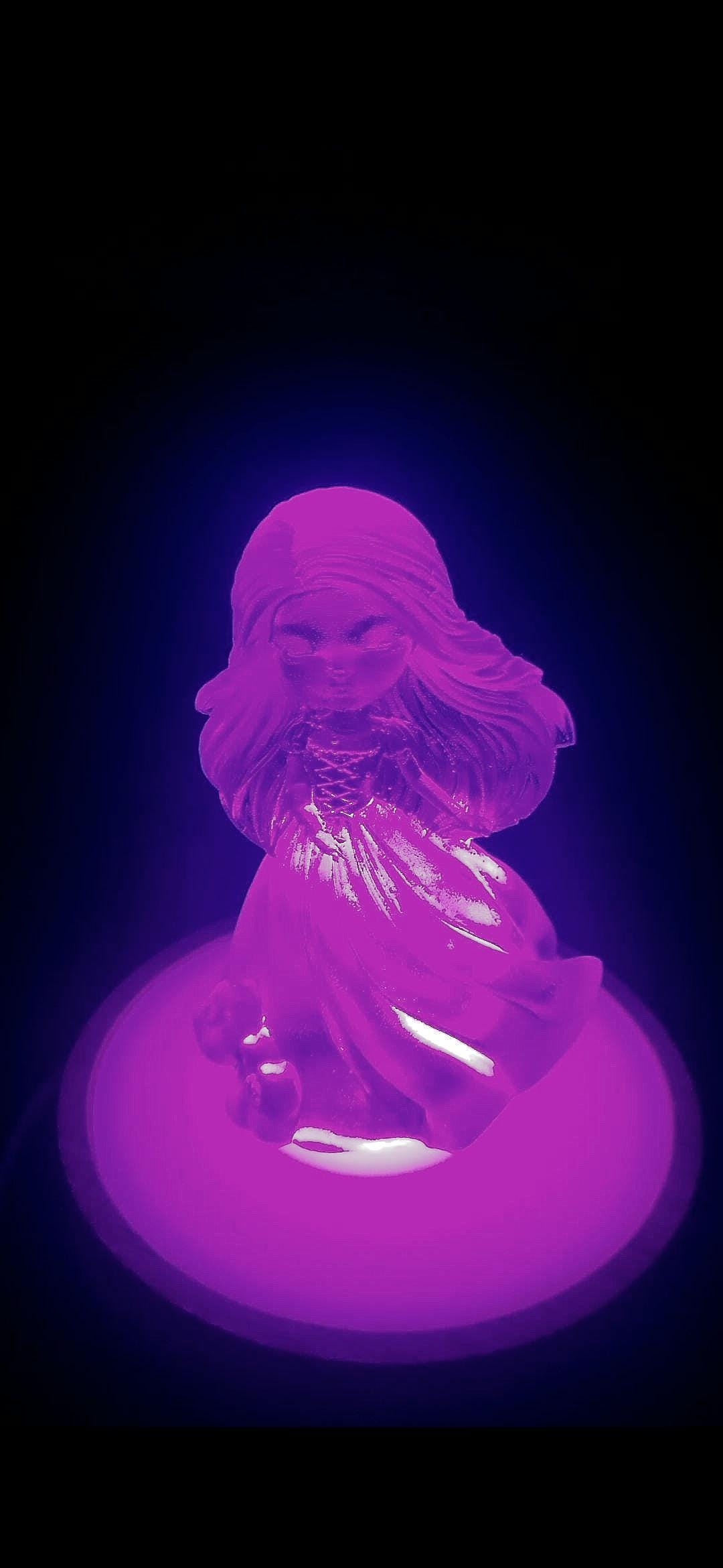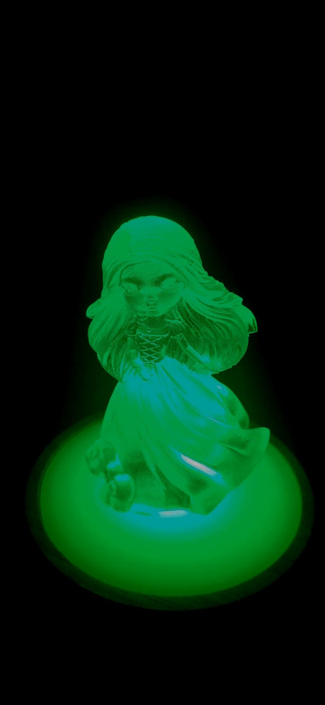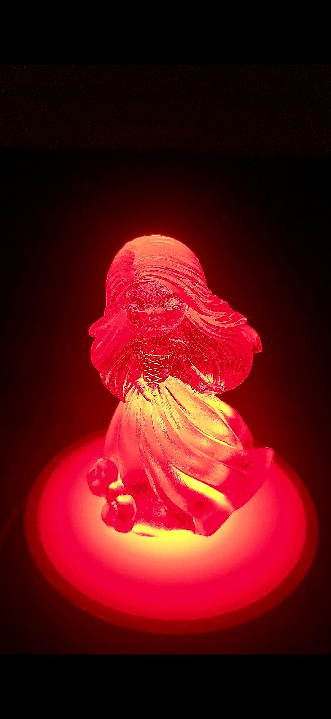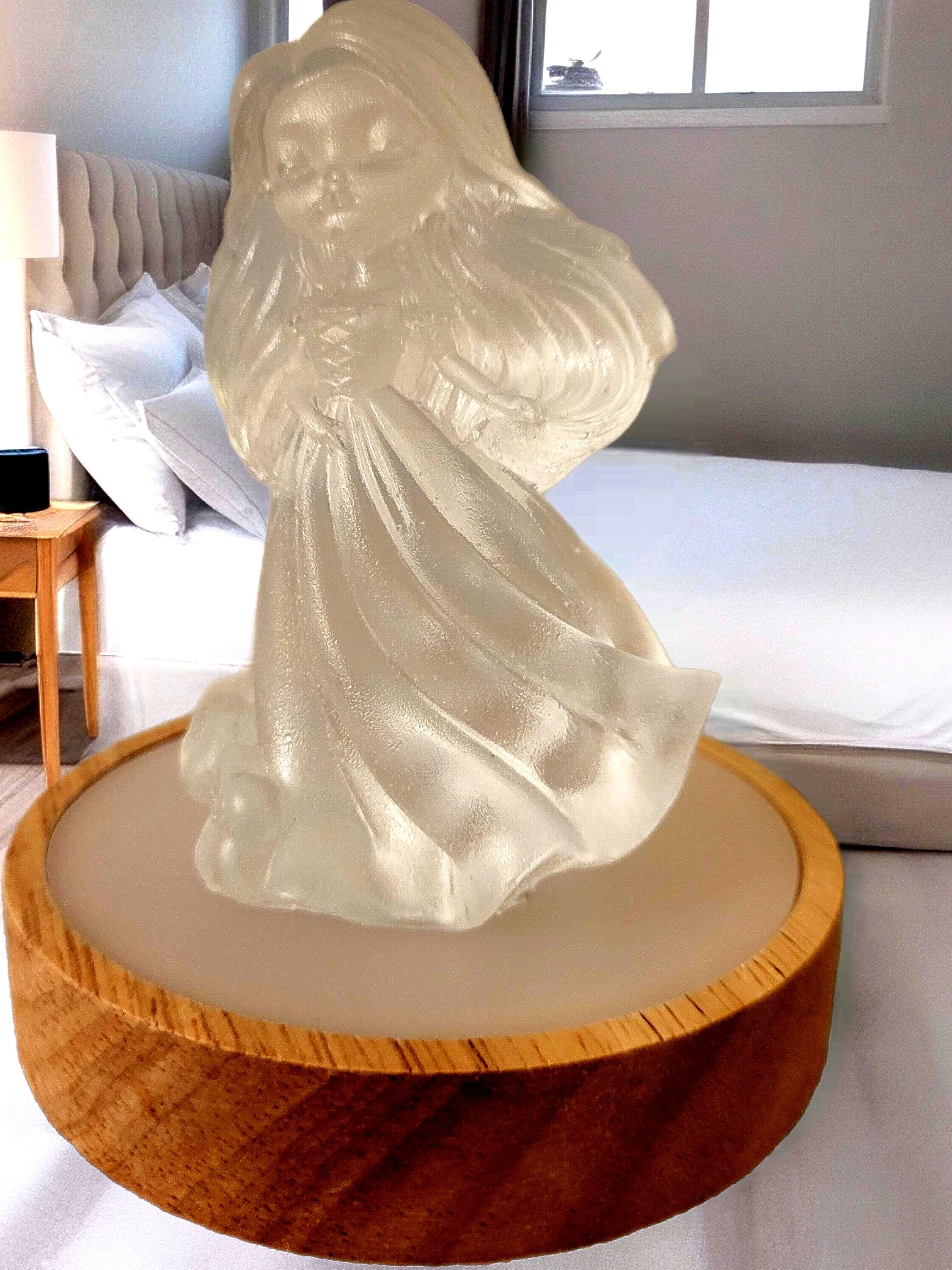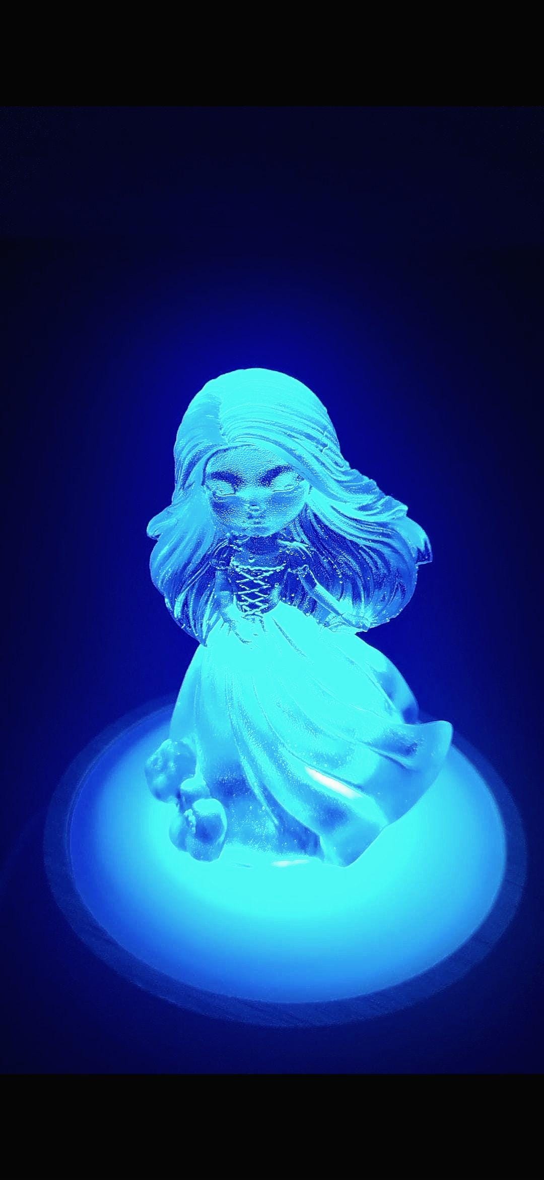 " Linda in the light" is a handcrafted Resin Doll that doubles as a gentle night light. It's unique design allows the doll to be separated from the light base, Offering versatility in display. This piece adds a whimsical charm to any space. making it ideal for Children's r, Nurseries, or as a thoughtful gift.